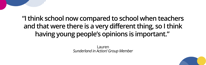 For the group, the meaning of youth-led action was clear. Ellie explained “So that young people get a chance in saying what they think is best for them because an adult speaking from a kid’s perspective isn’t the same because they haven’t experienced the same things as a child has.” Lauren added: “And I think school now compared to school when teachers and that were there is a very different thing, so I think having young people’s opinions is important.”